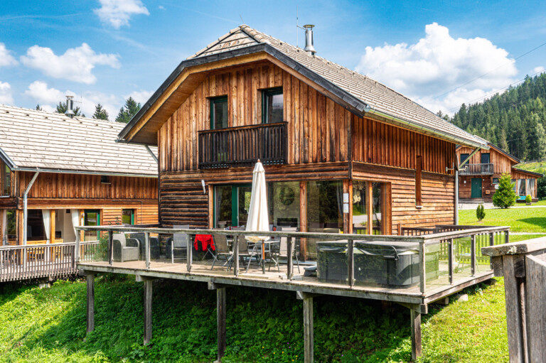 Wir starten mit dem KB 10a: Dieses Alpenhaus ist schwer zu übersehen. Es bildet aktuell die Mitte von unseren Chalets im Ferienpark Kreischberg. Einzigartig ist vor allem der überdachte Whirlpool auf der Terrasse. Somit ist man auch bei schlechtem Wetter geschützt.
